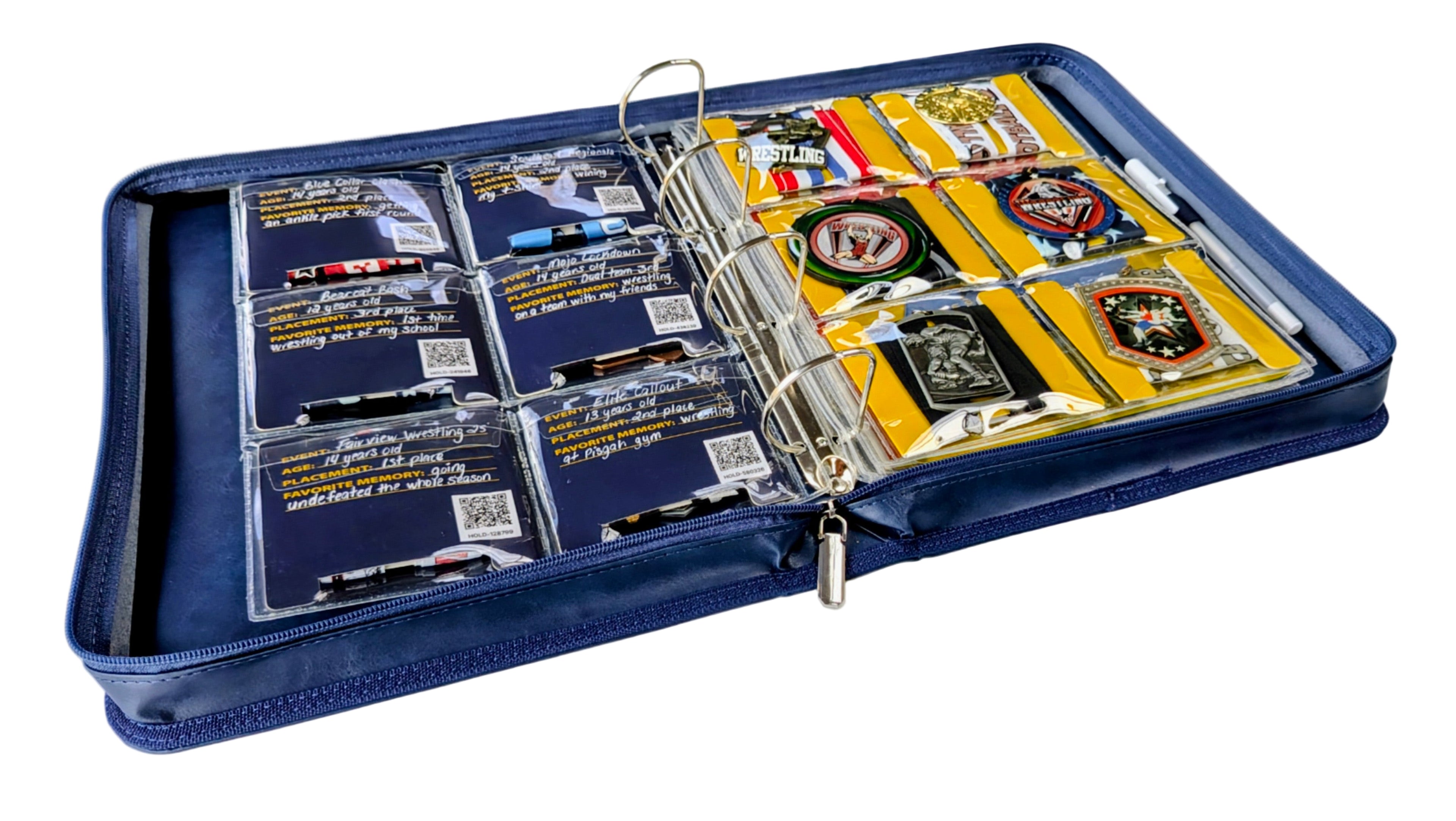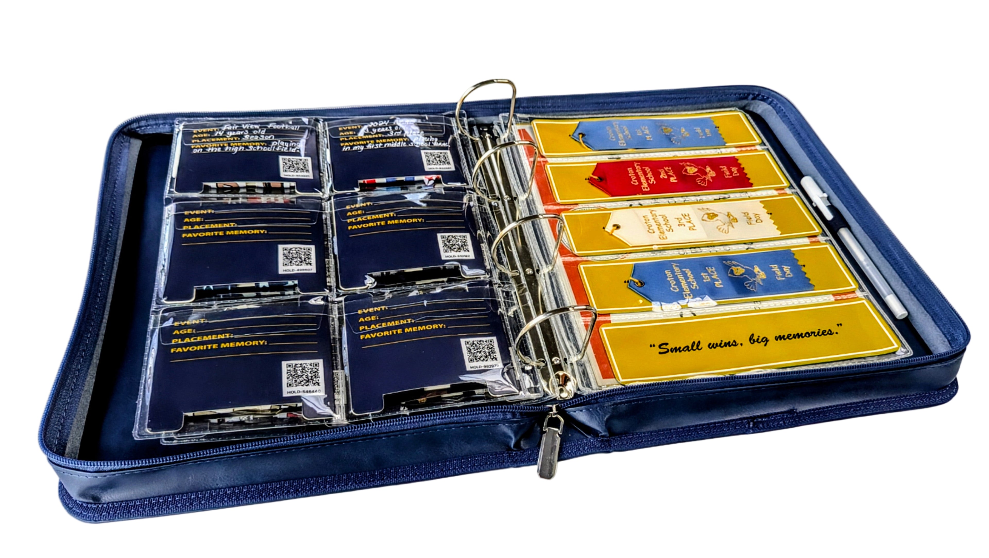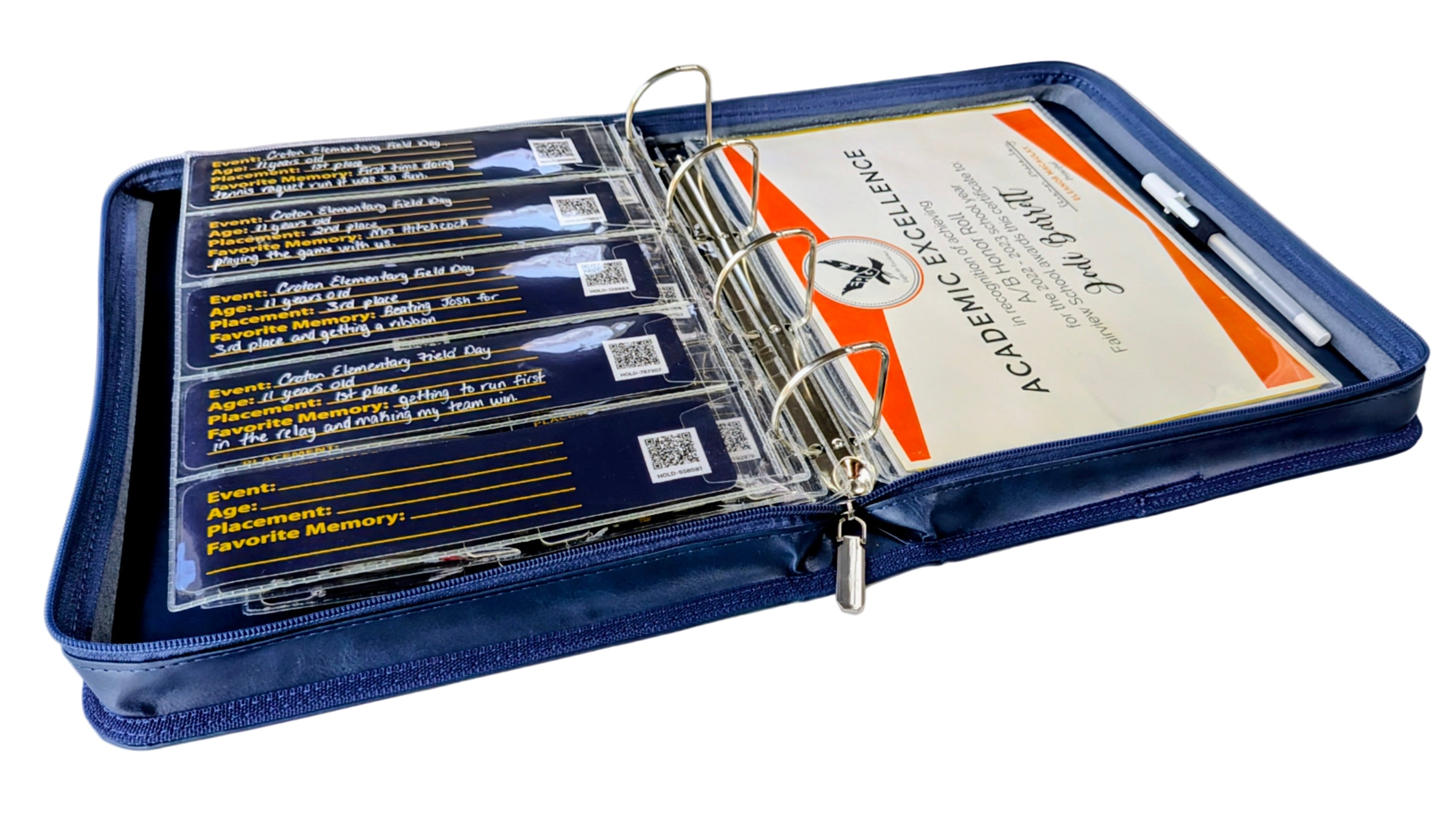 Every award pocket includes a QR-ready Memory Card™ so families can capture the story behind each win.