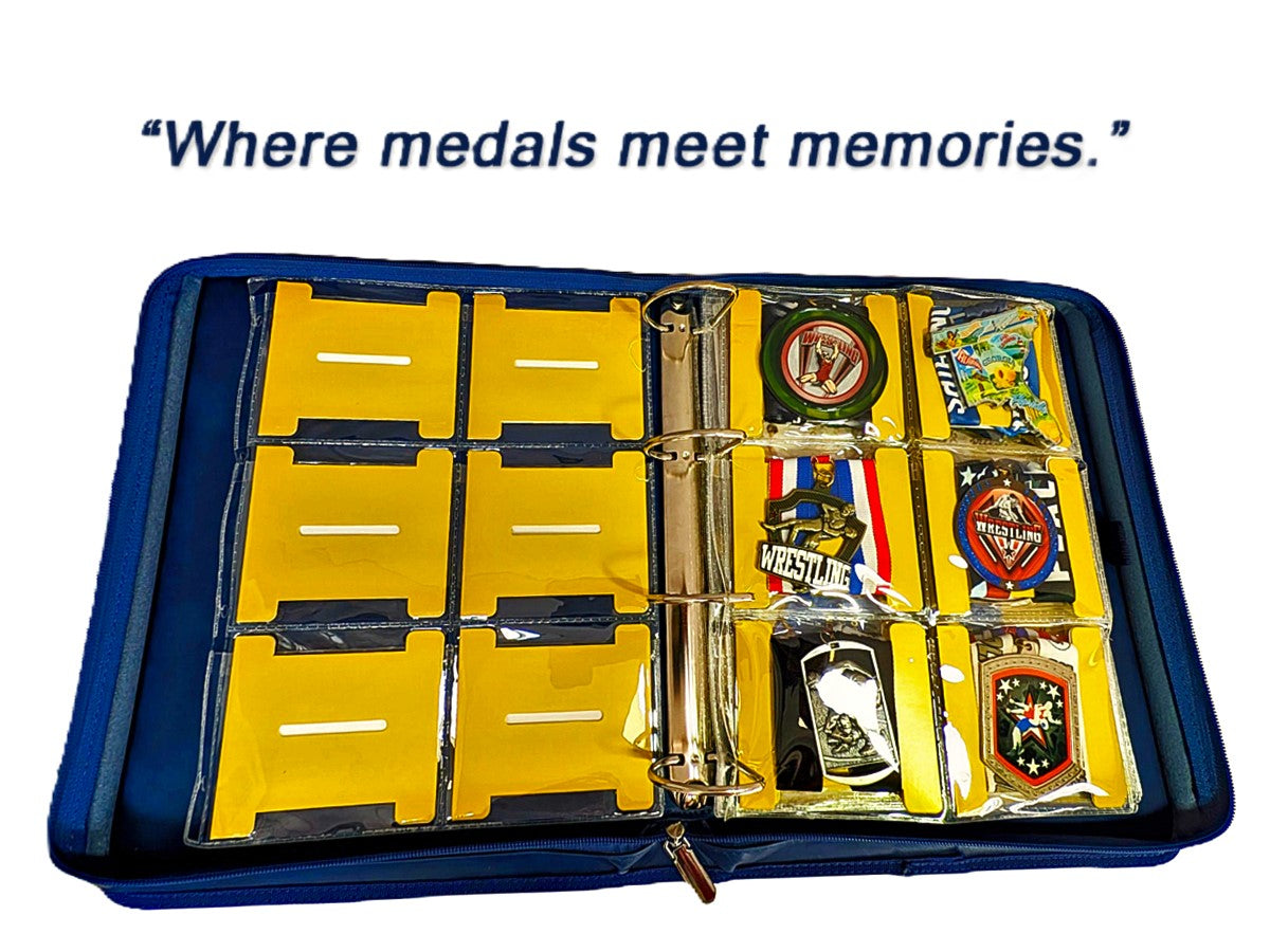 Each Award Holder is crafted in premium faux leather with gold detailing, smooth zippers, and our signature “stamp of honor.” Inside, custom-designed pages organize and display up to 30+ achievements — medals, ribbons, and certificates — each with its own guided journaling card and QR-code Memory Card™ to scan, upload and store every memory behind the win in your own digital trophy room (included with purchase of every binder).